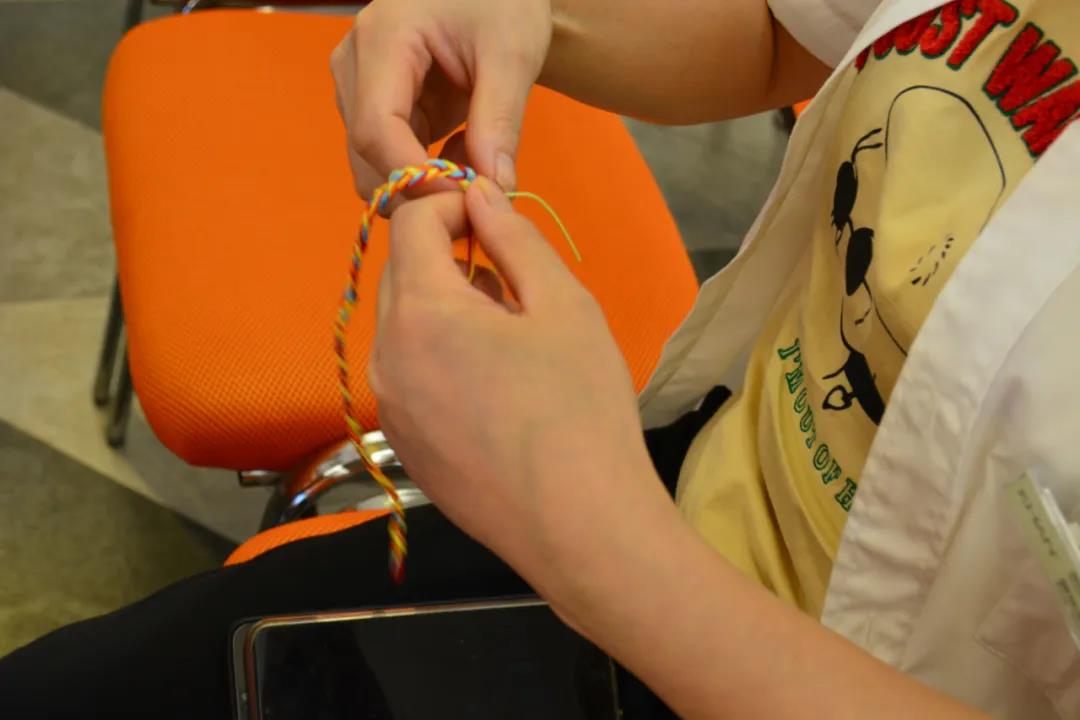 活動的最后,是編制五彩手繩,戴五彩手繩也是端午習俗的其中一種,有祈福的蘊意,祈福未來平平安安,好運相伴。